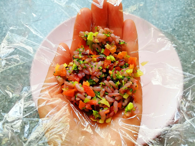 9、准备一张保鲜膜,放在手掌,然后用勺子将米饭舀入保鲜膜上,然后用手捏成团即可。有保鲜盒的将做好的饭团放入保鲜盒里,第二天带到公司,随时可以开吃。