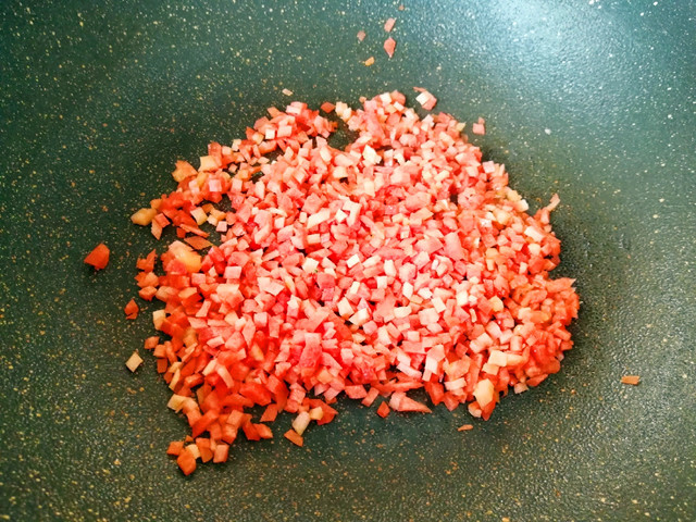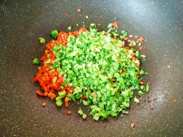 2、焯过水的西兰花和胡萝卜切碎备用。