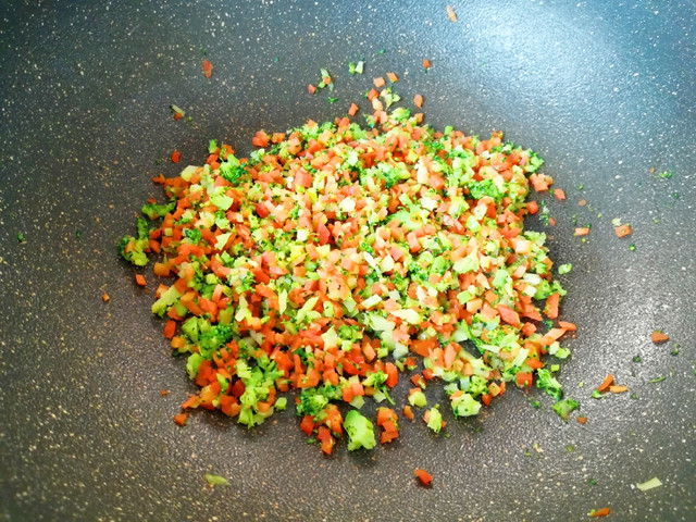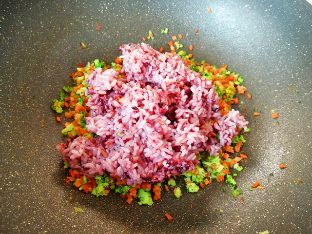 8、把杂粮饭倒入锅中和西兰花、胡萝卜一起翻炒均匀。