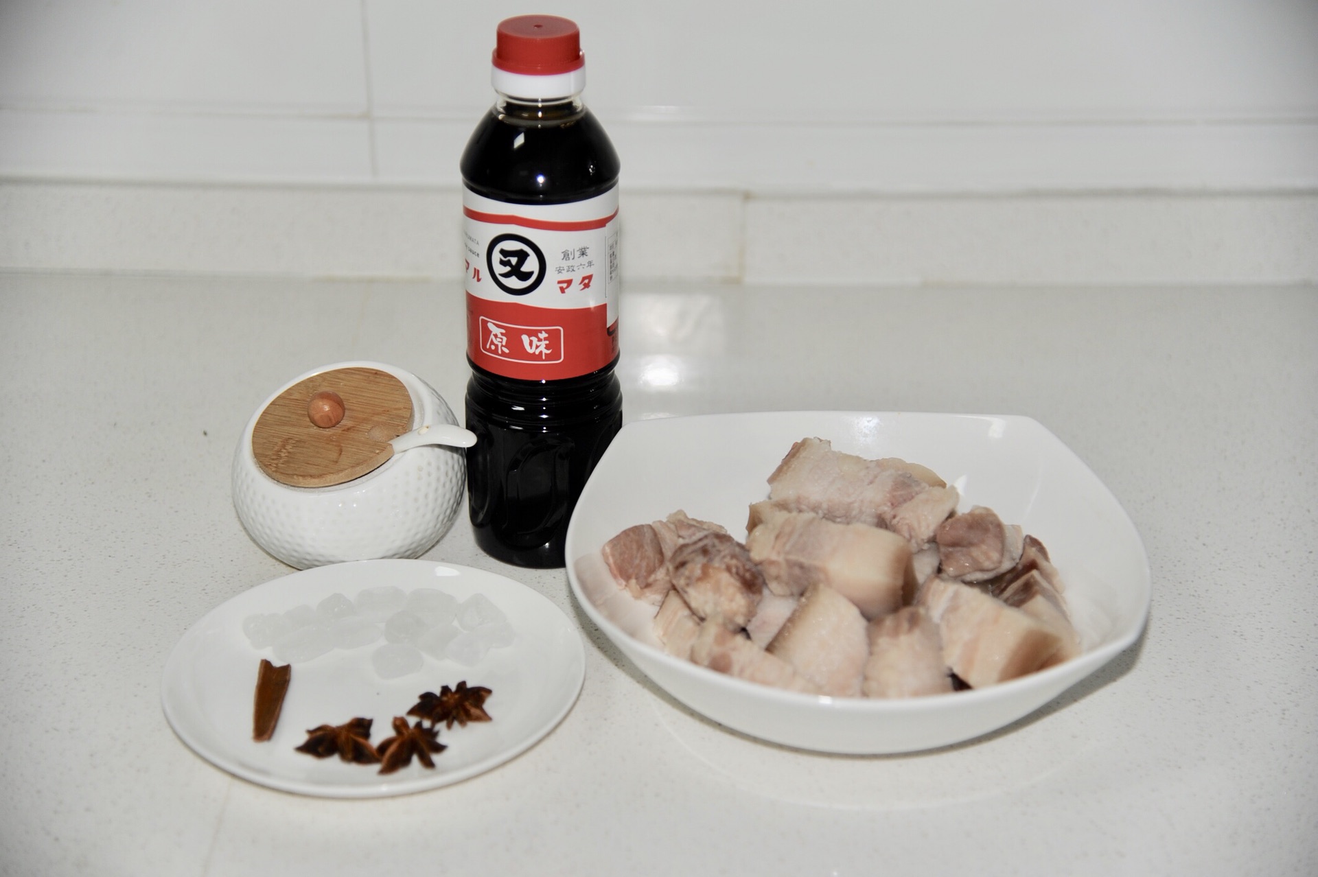 1. 要准备的食材有五花肉、又伊鲜原味酱油、盐、八角、桂皮、冰糖.