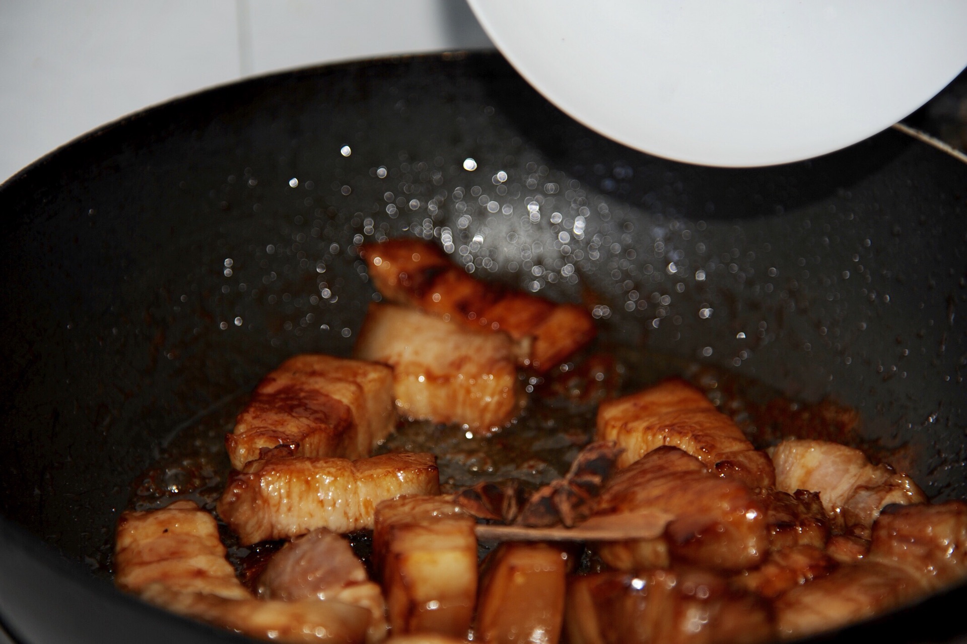 9. 放入水,沫过五花肉,再加入又伊鲜原味酱油10克